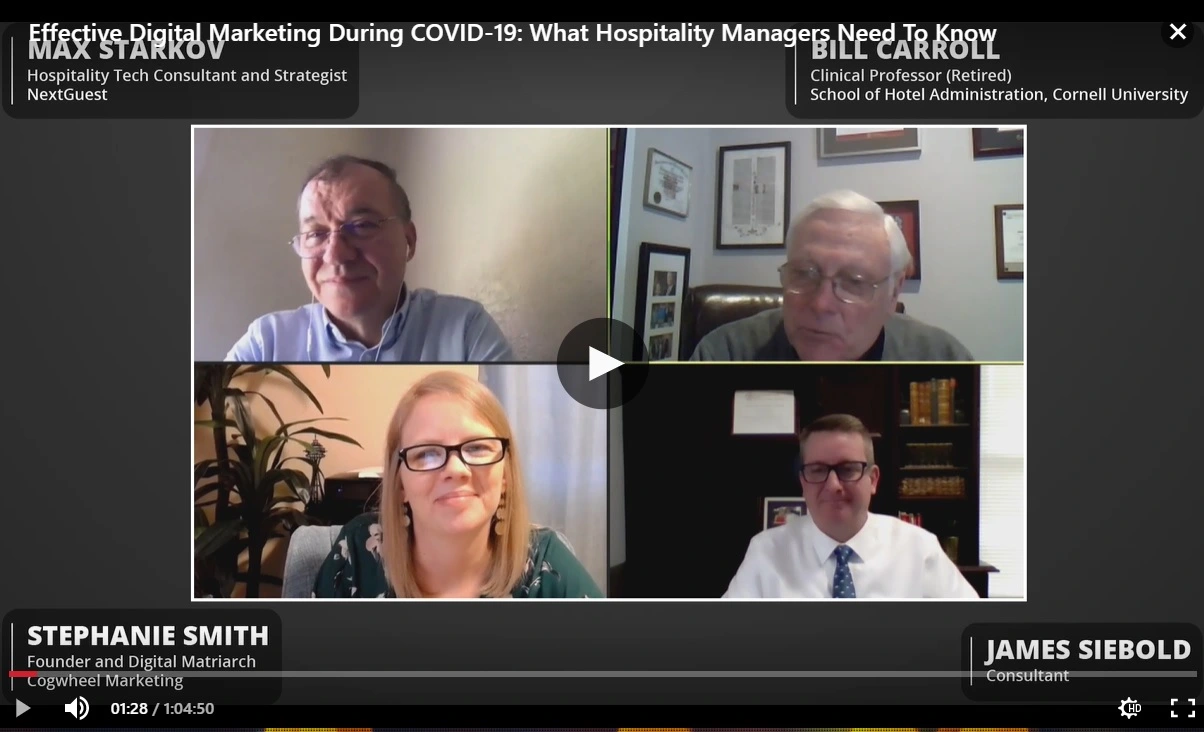 Stephanie Smith of Cogwheel Marketing joined hospitality experts Max Starkov and James Siebold on eCornell’s webinar, Effective Digital Marketing During COVID-19: What Hospitality Managers Need to Know, hosted by Bill Carroll.